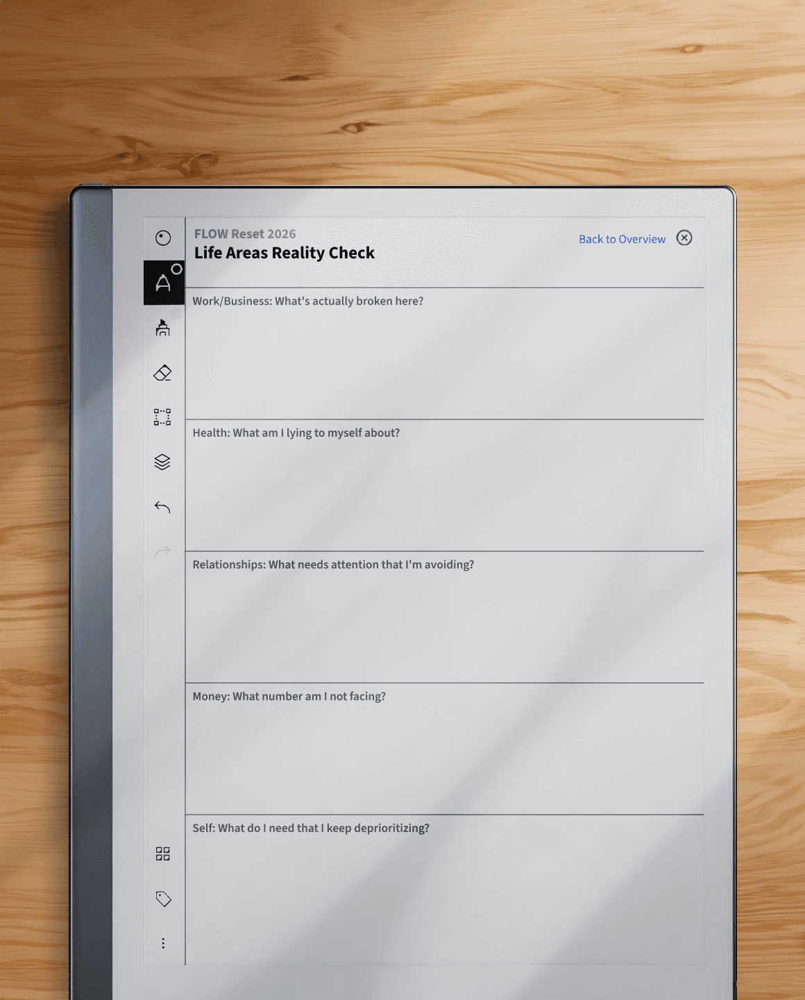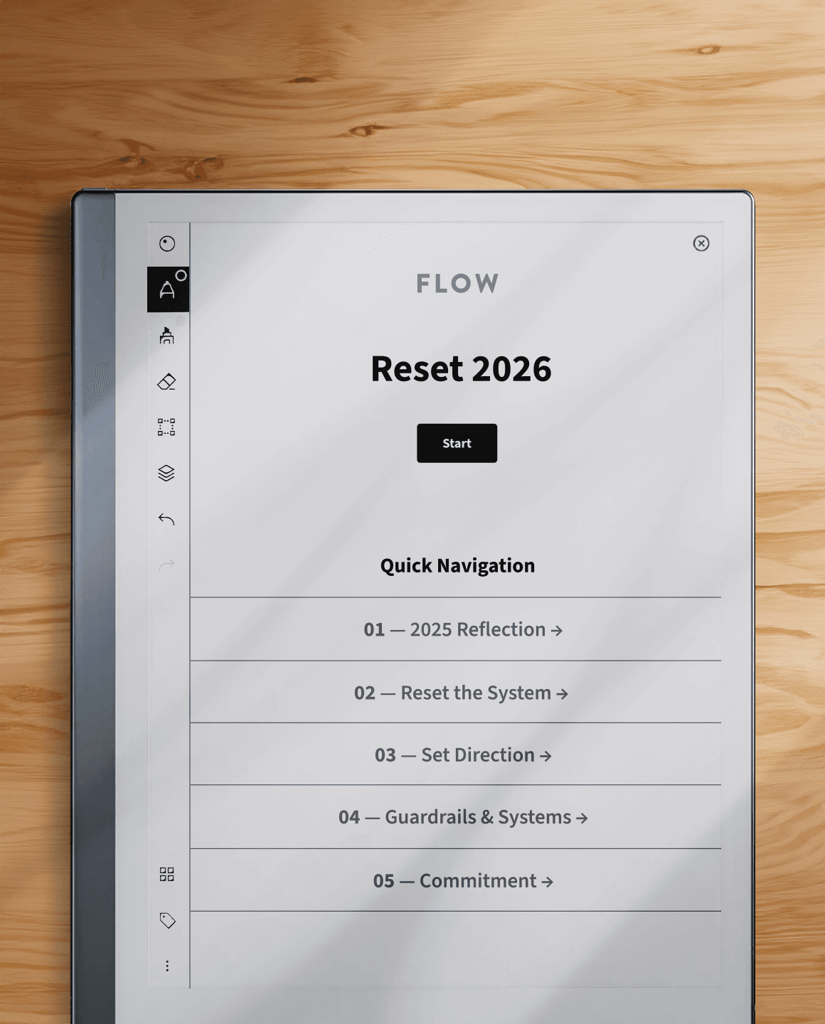 FLOW Reset is a free yearly planning template designed for reMarkable tablets. Unlike typical goal setting templates that encourage fantasy planning, this digital planner guides you through honest reflection, realistic constraints, and intentional execution.